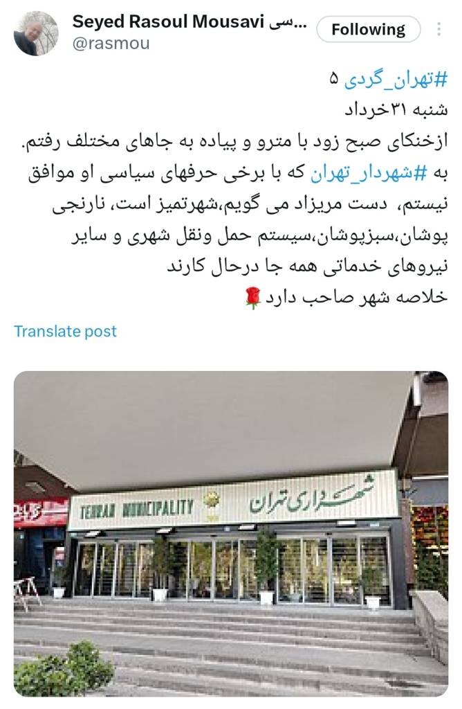 به گزارش خبرگزاری مهر، سید رسول موسوی، سفیر پیشین ایران در تاجیکستان و فنلاند گفت: به شهردار تهران دست مریزاد می گویم، شهرتمیز است، نارنجی پوشان، سبزپوشان، سیستم حمل ونقل شهری و سایر نیروهای خدماتی همه جا درحال کارند.